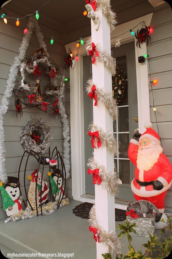 Anyhow.. Adore all the tinsel, & am coveting your hanging metal spiders & their red bows & your fantastic lights.. (we used to have similar when I was a kid, not the hideous & way less impressive LED things of today.. which manufacturers rarely make in interesting colours unless you're prepared to sell a limb to afford, & who can't seem to agree on what "warm white" lights mean..) & OH... to have a big blue eyed Santa blow mold... sigh... π So, so cool.. (wondering if you've put up your collection of smaller santas anywhere too?)